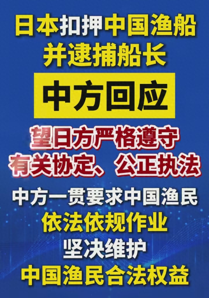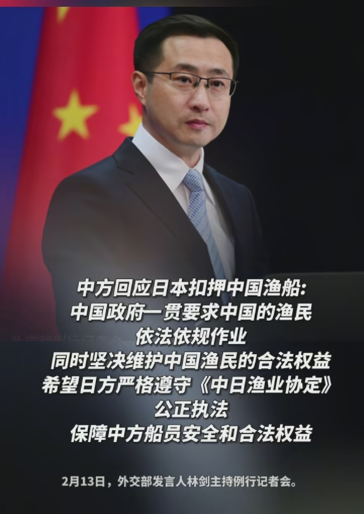 事发后第二天,外交部发言人林剑就明确回应,中国政府肯定要求渔民依法作业,但也会坚决维护渔民的合法权益,还严正要求日方遵守《中日渔业协定》,公正执法保障我方船员的安全和权益。