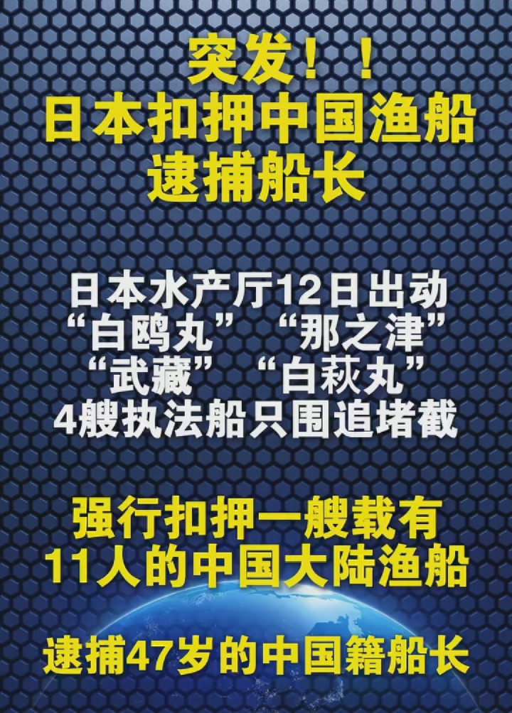 2月12日,在长崎县五岛市女岛西南约170公里的东海海域,日本水产厅突然出手,出动4艘执法船直接扣押了一艘中国虎网渔船,还逮捕了船上47岁的中国籍船长,船上其余10名船员也一同被限制,这事儿瞬间引发关注,也是日本时隔4年再次扣押中国大陆渔船。