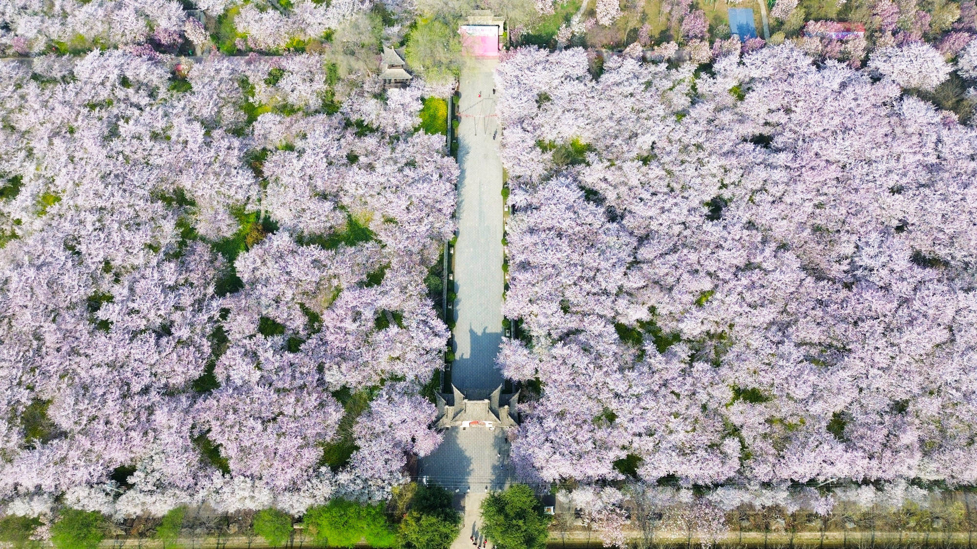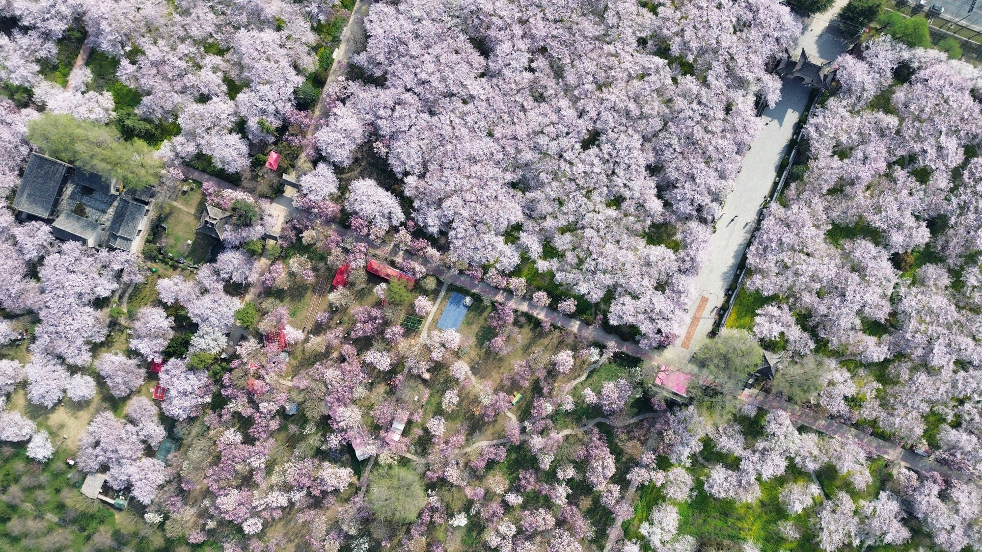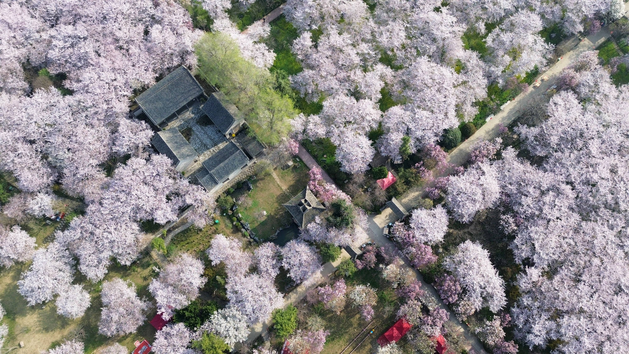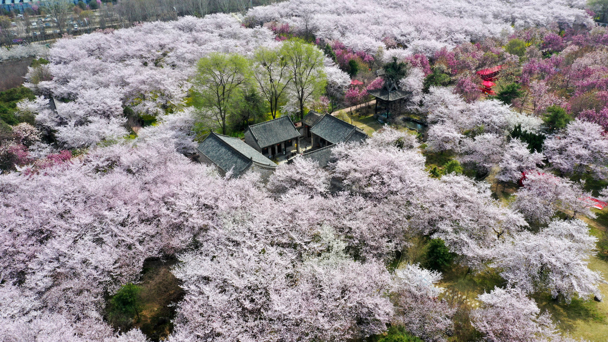 ↑2026年3月25日,河南省许昌市鄢陵县唐韵樱花园内樱花绽放。(无人机照片)CICPHOTO/牛书培 摄