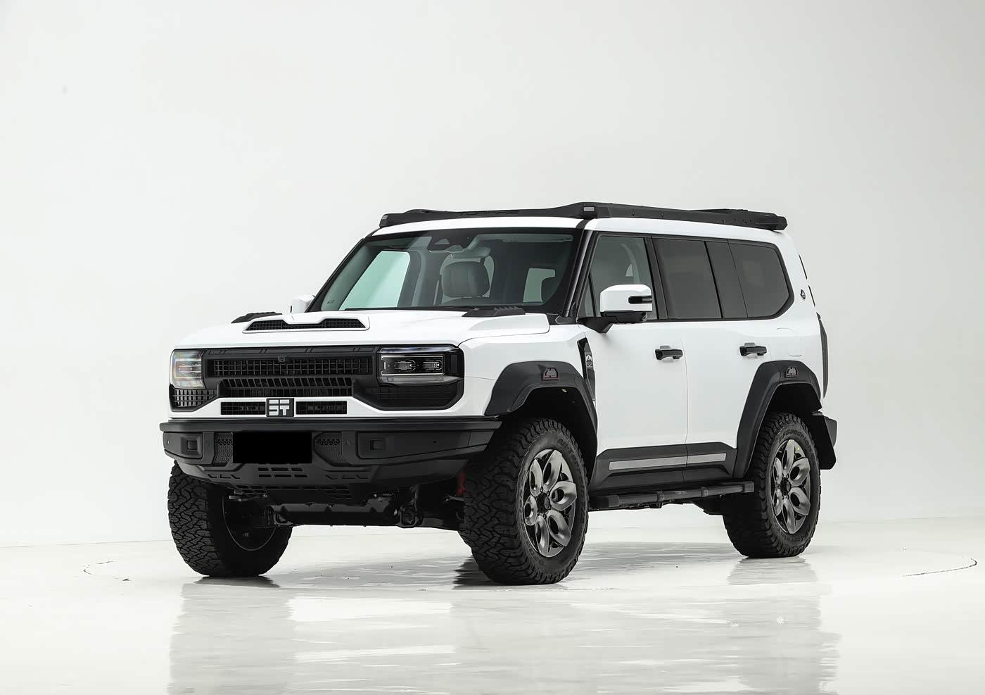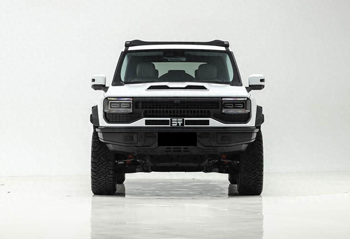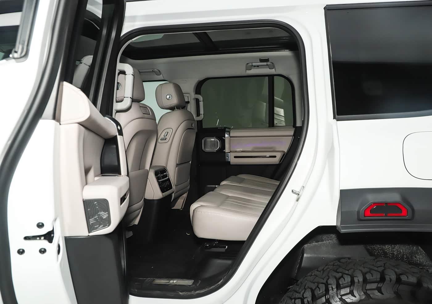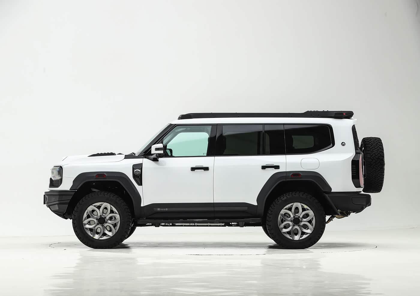 车身侧面部分,新车型在车顶增加了行李平台,轮眉使用了新的造型,全新的20英寸锻造越野轮圈使用了花瓣风格造型,搭配全地形轮胎,还使用了氮气减震。